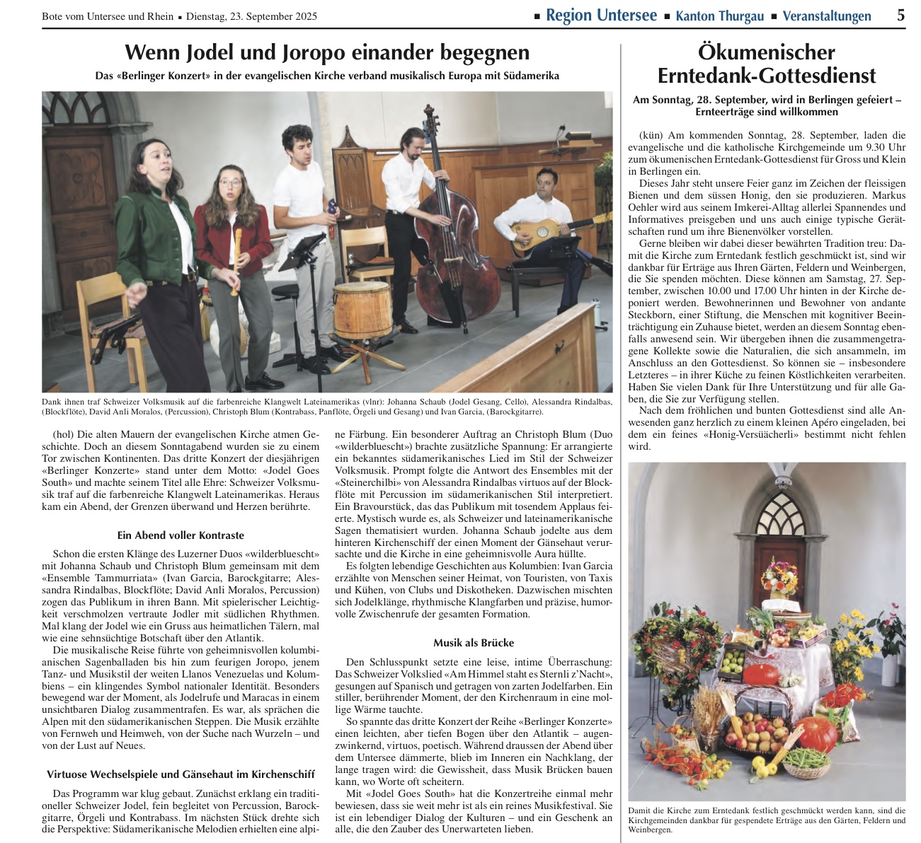Bildergalerie Videos Zeitungsartikel (Bilder) Zeitungsartikel (Links) 6. Juli 2019 Theater Altes Gymnasium – Sarnen, CH (Luzerner Zeitung)CLICK HIER 10. November 2019 10. November 2019 – Archäologische Sammlung, Freiburg im Breisgau (Badische Zeitung)CLICK HIER 18. Juli 2021 Open-Air Spitalgarten – Villingen-Schwenningen (Südwest Presse, Die Neckarquelle) CLICK HIER 30. Oktober - 5. November 2023 Tour Barcelona – Valencia, ES (Taschenspiegel)CLICK HIER Downloads Portfolio und Infos zu unserem Programm „Música Panamericana“